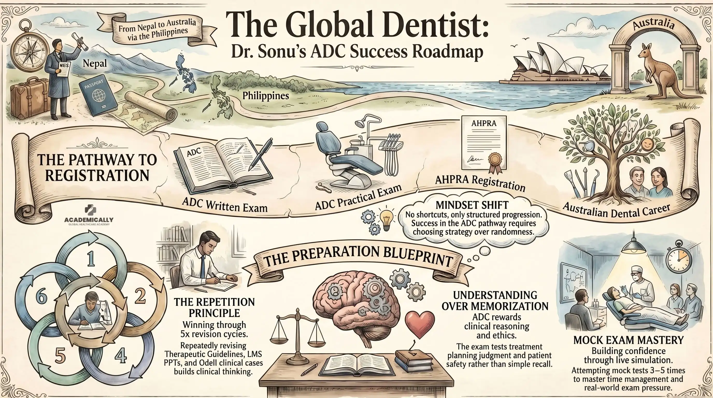 Dr. Sonu's interview surfaces three ideas that are worth internalising before you begin your own preparation, regardless of your background, country of training, or how many times you may have already attempted the ADC.